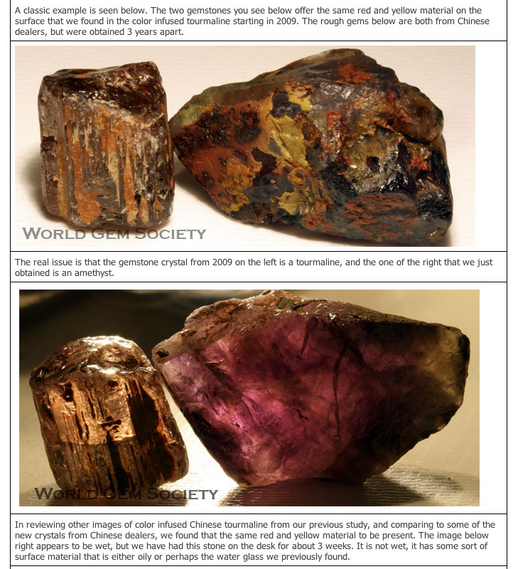 But let's get back to that newsletter. It focuses on horrifically stained stones, including the 93.10-ct amethyst you see below right. As an aside, if given the choice, we'd probably take a lump of coal in our Christmas stocking instead of this, but we digress. The amethyst below right was apparently purchased by YourGemologist of the International School of Gemology for the princely sum of US$0.99.